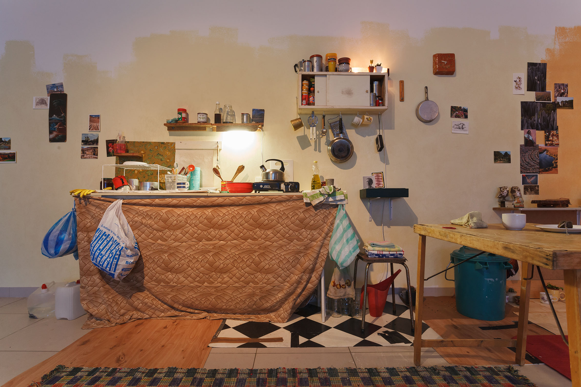 The artist contrasts her filmic portraits of these melancholic sites with a domestic environment that seems to be expecting the return of its mysterious inhabitant at any moment.